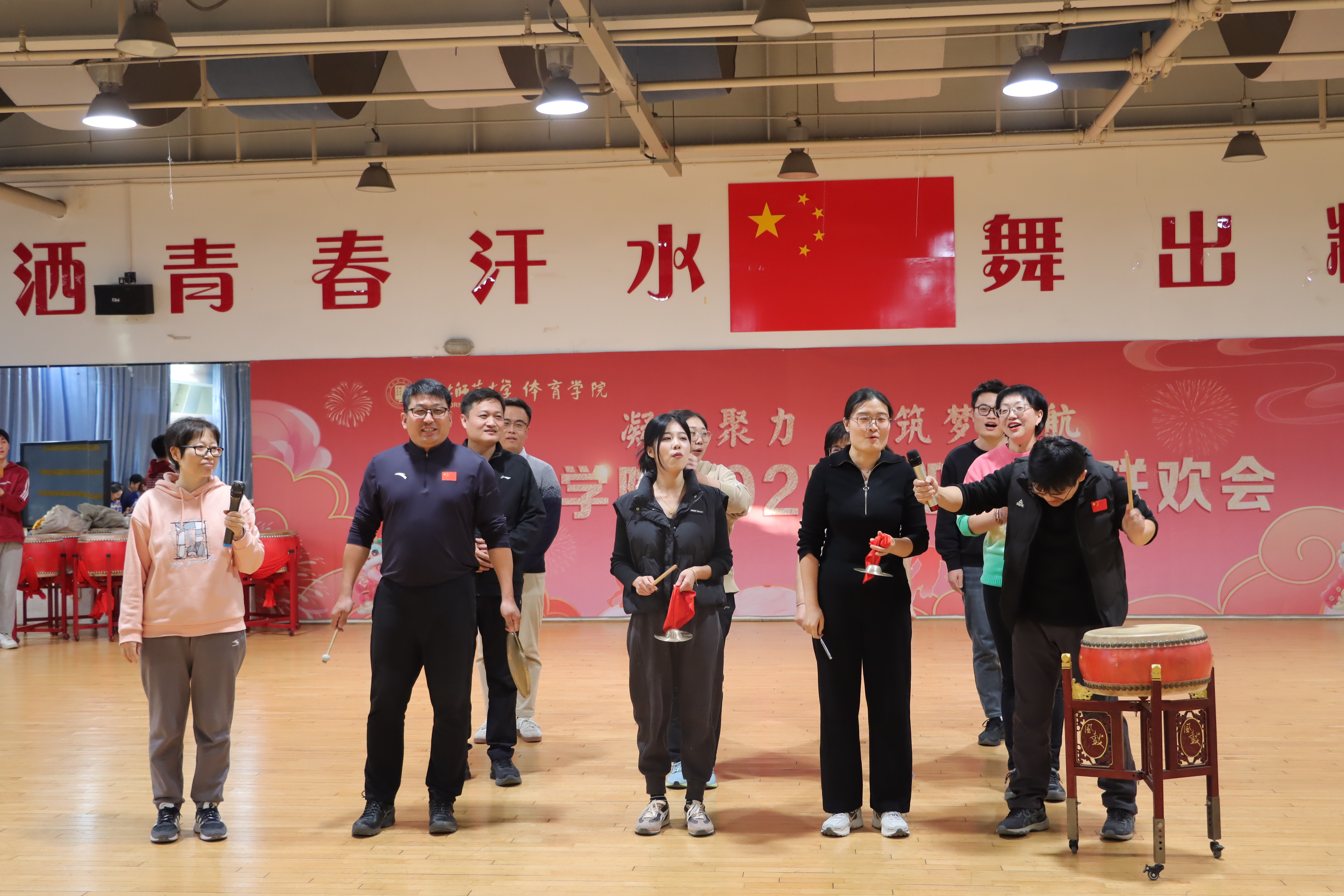 联欢过程中,公司领导班子走上舞台,向全体教职工致以节日的问候与美好的祝愿。经理马剑在致辞中细述了公司在教学、科研、竞赛等方面取得的显著成绩,这些离不开每一位教职工的辛勤付出与无私奉献;书记张晖在送上新年祝福的同时,也对新的一年寄语期望,希望大家继续秉持体育人的拼搏精神,凝心聚力、携手共进,为公司高质量发展贡献更多力量。随后,领导班子与教职工共同参与游戏、表演节目,现场氛围温馨融洽,展现了团队的凝聚力。