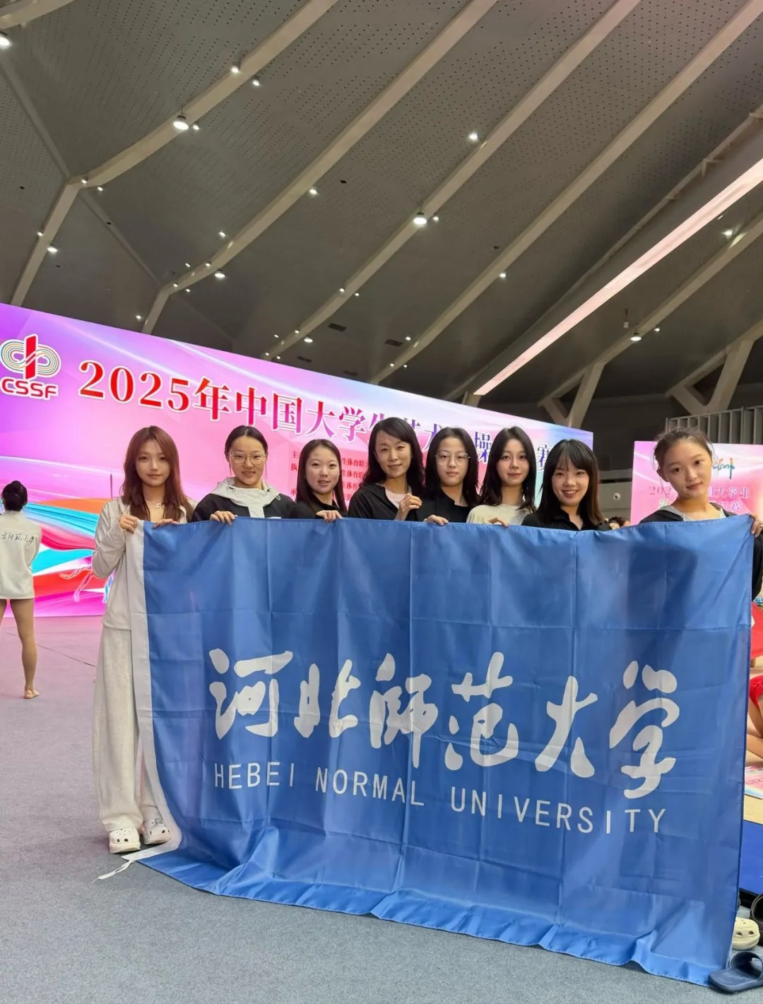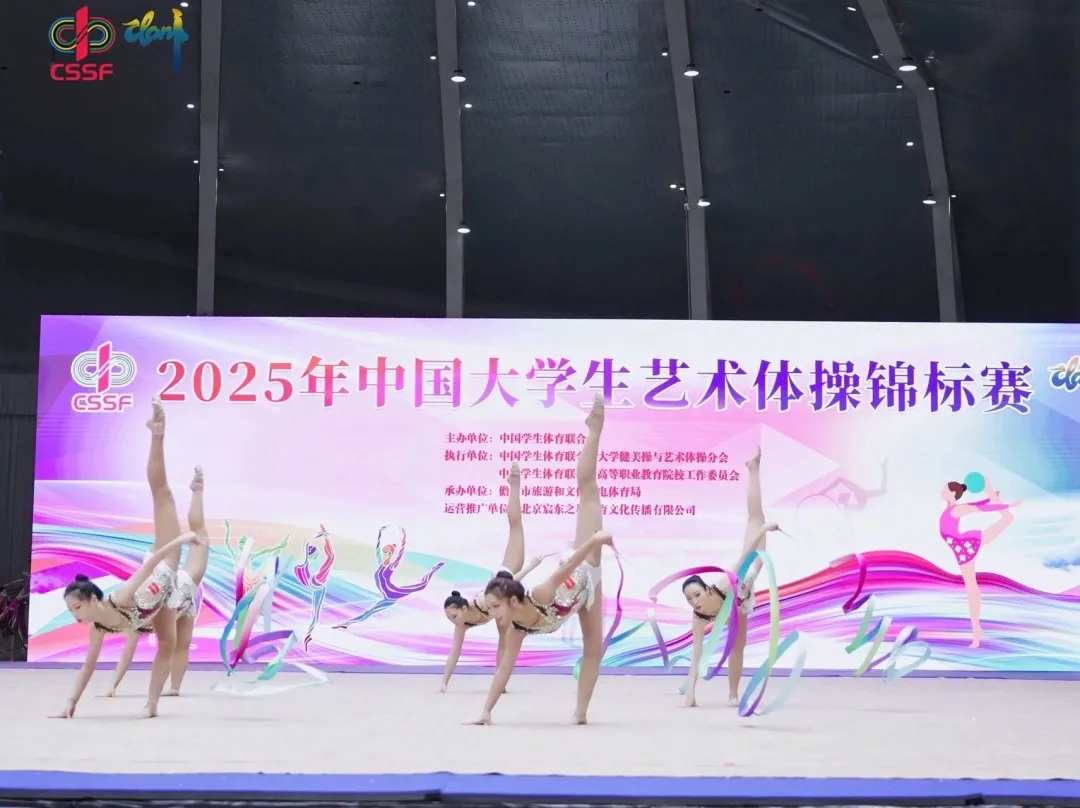 个人项目中,2025级赵若贤同学凭借扎实的专业功底,将身体的柔韧性与器械的灵动性完美融合,取得单项前八名。在集体项目赛场,由李小博、徐颖彧、申承凡、范雨函、范柯冉、范博涵组成的队伍,凭借流畅新颖的编排、默契的配合与富有感染力的表演,荣获第五名。